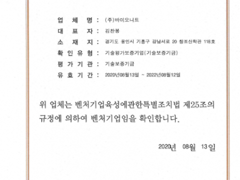 Bionit Inc., Venture Company Certification